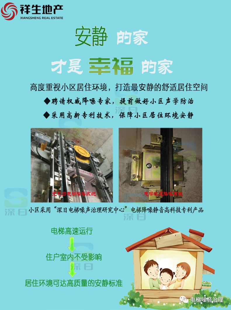 关于电梯,现实中人们生活离不开,但噪声却往往是躲不及。深日两项电梯降噪核心技术应用,让室内恢复安静。为了让广大业主放心入住,祥生地产公司还将技术的应用面向业主作了宣传说明,详见如下 :