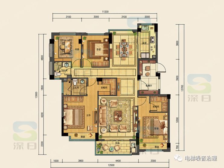 从户型图来看,很多人会担心并发问:难道高端豪宅也要遭受电梯噪声影响吗?呵呵,请各位看官稍安勿燥。该项目开发公司早在前期就对电梯噪声防治进行了专门的调研并采取了相应措施。小区采用的深日无机房静音系统、深日电梯导轨减振系统,很好地解决了上述电梯运行噪声对相邻住户室内环境的干扰影响,能够让室内保证同样的安静,让这个户型设计趋向完美。再请各位读者跟随我一起研究一个电梯降噪治理实况吧!